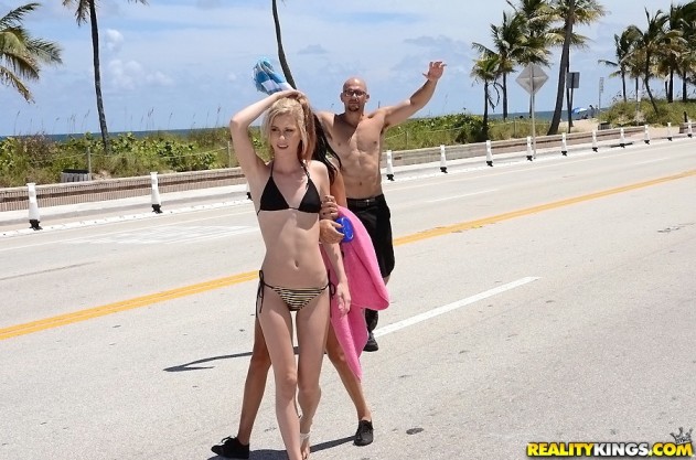 Tysen shows off her cameltoe in a skimpy bikini on the beach before she goes home with her horny boyfriend. She blows his knob then takes a good hard pounding in bed.